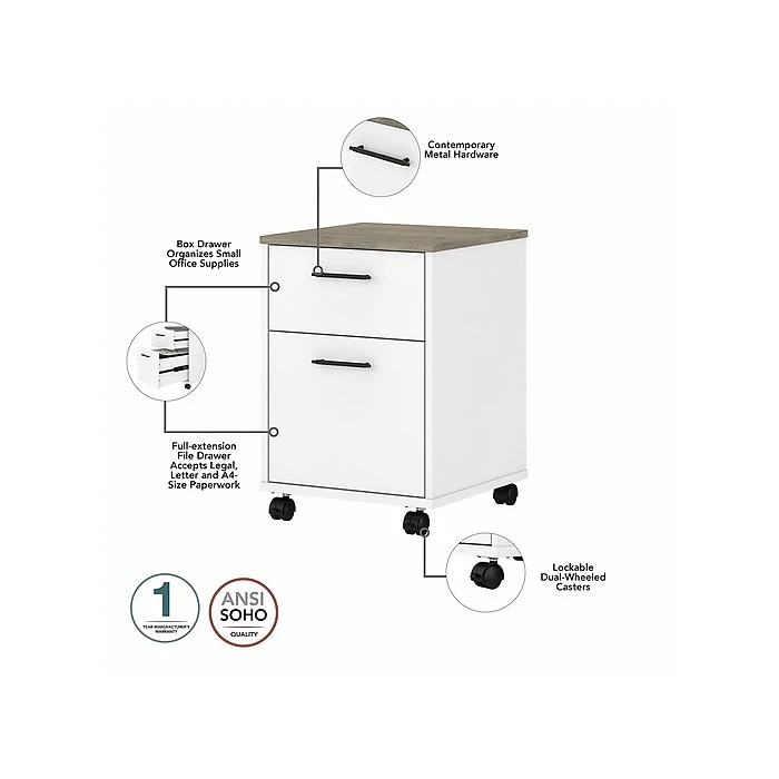 - File Cabinet can roll underneath the L Desk and features front-locking casters for secure placement