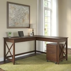 The Bush Furniture Key West 60″W L-shaped desk and two-drawer mobile file cabinet provide a practical home office furniture set with casual farmhouse style. This furniture set turns any room into a practical home office with easy-going style. Save floor space in compact areas by rolling the cabinet under the desk and placing the set in a corner, or make use of the fully finished backs to take a prominent position in the middle of the room. At 60″W x 60″D, the work surface is spacious enough to spread out with a computer, paperwork, and more when taking on your task of the day or just browsing the web. The two-drawer file cabinet rolls on dual-wheeled casters and locks into place for secure positioning. The file drawer opens on full-extension ball bearing slides and holds letter-size documents while a box drawer provides storage for office supplies and utensils. This home office furniture set is tested to meet ANSI/SOHO standards for safety and performance and is backed by a 1-year warranty.