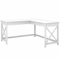 The Bush Furniture Key West 60″W L-shaped desk features an easy-going style that makes it a perfect choice for your casual home office or living space. Save floor space in compact areas by placing the desk in a corner or make use of the fully finished back to take a prominent position in the middle of the room. The durable work surface is spacious enough to spread out with a computer, paperwork and more when taking on your task of the day or just browsing the web. A sturdy post leg design with unique X pattern accents on the side panels creates a relaxed, open appearance while thoughtful construction and quality materials allow the corner desk to support up to 200 pounds. This L-shaped computer desk is tested to meet ANSI/SOHO quality standards for safety and performance and is backed by a 1-year manufacturer’s warranty. See the full collection for coordinating items available.