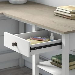 The Bush Furniture Mayfield 60″W L-shaped computer desk with two-drawer lateral file cabinet gives your home office a touch of modern farmhouse style. Stay on top of your daily tasks with a workspace that suits your casual home. Highlighted by its relaxed modern farmhouse style, the Bush Furniture Mayfield 60″W L-shaped computer desk with two-drawer lateral file cabinet also includes plenty of features to keep you feeling productive. Spread out on a durable 60″W x 60″D corner desk surface that supports a computer, books and more with a weight capacity of 200 pounds. Two shelves and a box drawer ensure that papers and supplies are always within reach. Store your legal, letter and A4-size documents in the lateral filing cabinet, which matches the L-shaped desk’s height for an extended work area when placed side by side. File drawers open on smooth full-extension ball bearing slides for an easy reach to contents. This farmhouse desk with storage set is tested to meet ANSI/SOHO standards for safety and performance and is backed by a 1-year warranty.