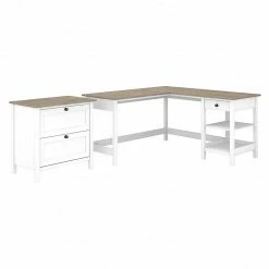 The Bush Furniture Mayfield 60″W L-shaped computer desk with two-drawer lateral file cabinet gives your home office a touch of modern farmhouse style. Stay on top of your daily tasks with a workspace that suits your casual home. Highlighted by its relaxed modern farmhouse style, the Bush Furniture Mayfield 60″W L-shaped computer desk with two-drawer lateral file cabinet also includes plenty of features to keep you feeling productive. Spread out on a durable 60″W x 60″D corner desk surface that supports a computer, books and more with a weight capacity of 200 pounds. Two shelves and a box drawer ensure that papers and supplies are always within reach. Store your legal, letter and A4-size documents in the lateral filing cabinet, which matches the L-shaped desk’s height for an extended work area when placed side by side. File drawers open on smooth full-extension ball bearing slides for an easy reach to contents. This farmhouse desk with storage set is tested to meet ANSI/SOHO standards for safety and performance and is backed by a 1-year warranty.