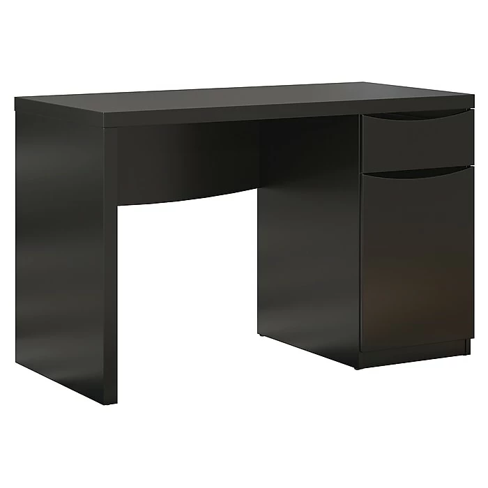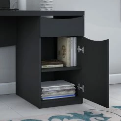 With an attractive, contemporary design, the Bush Furniture Montrese Computer Desk fits in small spaces but offers total functionality. Let the modern styling blend seamlessly into your home office, bedroom, dorm or living room. The compact design and finished back provide placement flexibility – so put the small desk in a tight space or the middle of a room. The stylish but sturdy desk comes with reliable features, allowing Montrese to work in a home office or small business. Spread out with your laptop, pay bills, surf the net or finish homework on the durable surface. Store office supplies in the smooth box drawer, which glides on ball bearing slides for easy access to contents. Hide larger items from sight in the closed storage cabinet with an adjustable shelf and smooth, self-closing European-style hinges. Durable edge banding helps prevent nicks. Backed by a 1 Year Warranty.