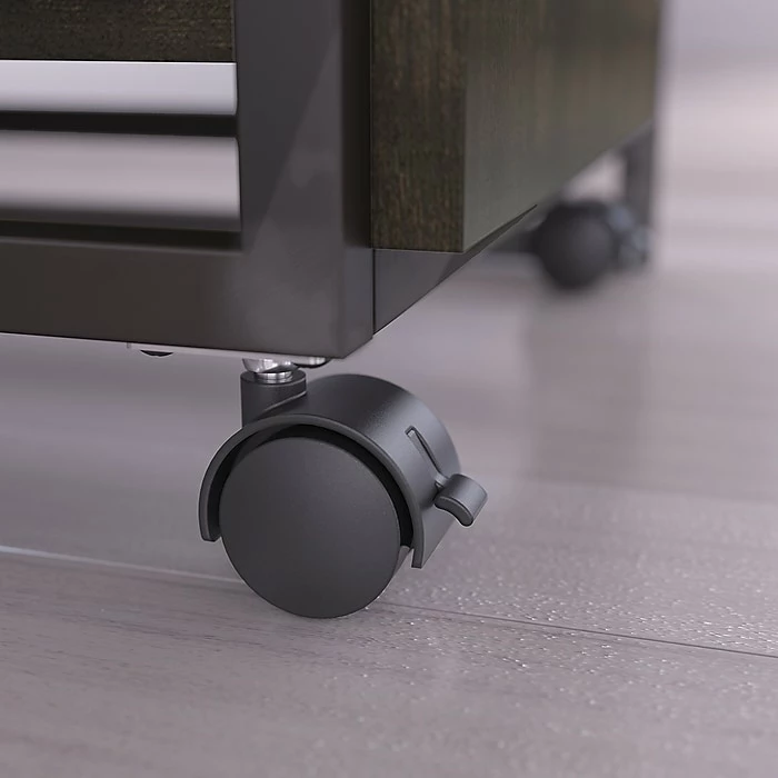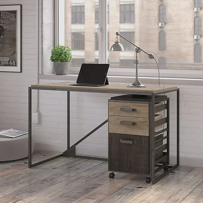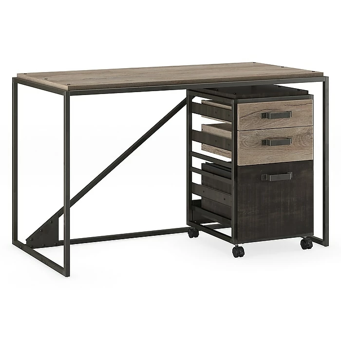 Unique reclaimed looks, industrial appeal and a sturdy space-saving design. The Bush Furniture Refinery 50W Industrial Desk gives your home office, loft or creative space a weathered charm to match your rustic decor. The Industrial Steel frame and exposed bolts join a durable work surface finished in a distressed Rustic Gray to create a table desk you’ll love to use and admire. Spread out with your laptop, projects, crafts or a good book and a cup of coffee with room to spare. A perfect match for your Industrial Desk, the Mobile File Cabinet rolls anywhere or locks into place. A full-extension file drawer opens on smooth ball-bearing slides for easy access to the back. Store pens, papers and other supplies in a pair of box drawers. Display your rustic tastes with the 50 inch Industrial Desk with Mobile File Cabinet, backed by a 1 Year Warranty. Meets ANSI/SOHO furniture standards.