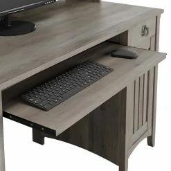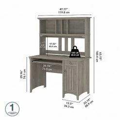 The Bush Furniture Salinas small computer desk with hutch takes timeless Mission styling and adds plenty of modern touches to help you complete your daily tasks. Technology-ready features include a pullout keyboard tray or laptop shelf and a work surface with a built-in wire management system to keep cords and cables in order. The hutch has plenty of storage space for work in progress, books, decorations, and more while the 48″W desk features a vertical cabinet with one adjustable shelf along with a box drawer to organize office supplies and writing utensils. This computer desk is perfect for small spaces. The compact design boasts a sturdy construction with clean lines, tapered legs, and attractive wood detailing. The durable desktop supports up to 150 lbs. and offers ample space to complete projects and assignments, pay bills, or surf the web. This home office desk set is backed by a 1-year warranty.