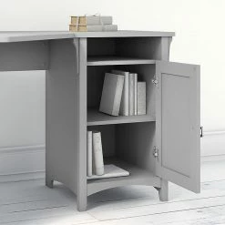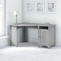 The Bush Furniture Salinas 55″W corner desk with storage features a space-saving design and casual farmhouse styling that’s perfect for your home office. The Bush Furniture Salinas 55″W corner desk with storage combines casual style and a practical, space-saving design that makes it a perfect choice for your small home office. Tackle your next project on the 55-inch desk surface while keeping materials organized inside the attached storage cabinet. The cabinet can be placed on either side to form a right or left-handed configuration and contains one adjustable shelf to accommodate items of various sizes. Use the open cubby space to keep supplies and work-in-progress accessible when you need them. Inspired by timeless mission style, the small computer desk features tapered legs, curved base rails, decorative wood accents and your choice of three finishes that work well with farmhouse and cottage decor. This L-shaped desk with storage is tested to meet ANSI/SOHO quality standards for safety and performance and is backed by a 1-year warranty.