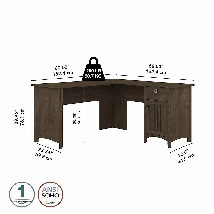 Make your home office space comfortable, functional, and beautiful with the Bush Furniture Salinas L-shaped computer desk with storage. Attractive wood details, vertical accents, curved base rails, and tapered legs inspired by Mission styling create a casual look fit for any cottage, family home, or apartment. You’ll love all the room you have to multitask on the L-shaped desk designed to save space in your home with a variety of placement options, including in the corner. The desktop supports up to 200 lbs., so you can get to work with all your materials close by. Store writing utensils and small office supplies in the convenient box drawer and keep larger items in a vertical storage cabinet that features an adjustable shelf. This corner desk with storage is tested to meet ANSI/SOHO quality standards for safety and performance and is backed by the Bush Furniture 1-year manufacturer limited warranty.
