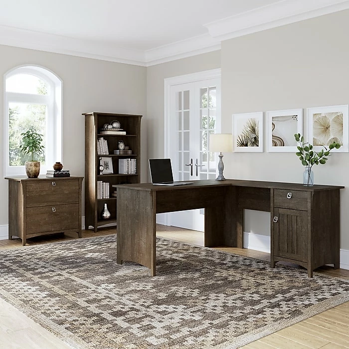 Create a home office space that’s comfortable, functional, and beautiful with the Bush Furniture Salinas L-shaped desk with file cabinet and five-shelf bookcase. You’ll love all the room you have to multitask on the L-shaped desk surface designed to save space in your home with a variety of placement options, including in the corner. A box drawer stores small office supplies while a storage cabinet includes an adjustable shelf for larger items. The bookcase’s three adjustable shelves make it easy to display books, photos, and more while two fixed shelves provide stability. For your legal- and letter-size documents, the lateral file cabinet contains spacious drawers that open on full-extension ball bearing slides. The corner desk with bookshelf and file cabinet office furniture set is tested to meet ANSI/SOHO quality standards for safety and performance.