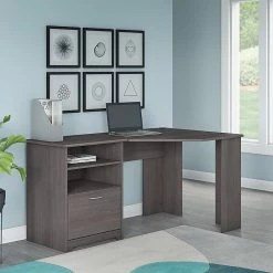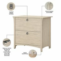 The Bush Furniture Salinas 60″W computer desk with bookcase and lateral file cabinet offers a practical home office solution with a casual farmhouse style. Take on your next project or assignment with a computer and materials on a durable desktop that supports up to 200 lbs. The work surface also includes a built-in wire management grommet to keep cords and cables out of the way. A shelf pulls out for easy access to your keyboard or laptop, while a box drawer and storage cabinet organize miscellaneous office supplies. The file cabinet’s drawers open on smooth ball bearing slides for an effortless reach to letter-, legal-, and A4-size paperwork. The tall bookcase includes three adjustable shelves for flexible storage and two fixed shelves for stability. This farmhouse desk with storage has been tested to meet ANSI/SOHO standards for safety and performance and is backed by a 1-year manufacturer warranty.