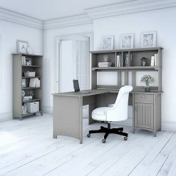 Featuring a comfortable design and plenty of storage capacity, the Bush Furniture Salinas 60W L Shaped Desk with Hutch and 5 Shelf Bookcase offers an ideal home office solution for those who value both style and function. Spread out and multitask on the L Shaped surface, designed to save space by fitting into a corner. Store writing utensils and small office supplies in the convenient box drawer and keep larger items in a storage cabinet with an adjustable shelf. The 60W Hutch attaches to either side of the corner desk and features two large open cubby areas as well as a pair of smaller spaces for storage and display. A pair of fixed shelves give the Bookcase stability while three adjustable shelves allow you to store items of various sizes. This cottage style furniture set is tested to meet ANSI/SOHO quality standards for safety and performance and is backed by a 1 year warranty.