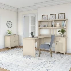 Featuring a comfortable design and plenty of storage capacity, the Bush Furniture Salinas 60W L Shaped Desk with Hutch and Lateral File Cabinet offers an ideal home office solution for those who value both style and function. Spread out and multitask on the L Shaped surface, designed to save space by fitting into a corner. Store writing utensils and office supplies in the convenient box drawer and keep larger items in a storage cabinet with an adjustable shelf. The Hutch attaches to either side of the corner desk and features 2 large open cubby areas as well as 2 smaller spaces for storage of books, decorations and more. The 2 drawer filing cabinet opens on full-extension ball bearing slides for an easy reach to legal and letter size documents. This cottage style furniture set is tested to meet ANSI/SOHO quality standards for safety and performance and is backed by a 1 year warranty.