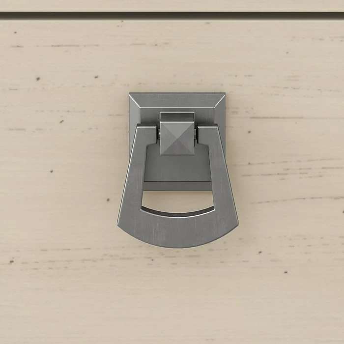 - Elegant metal drop pull hardware finished in stylish Tumbled Pewter