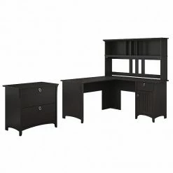 Featuring a comfortable design and plenty of storage capacity, the Bush Furniture Salinas 60W L Shaped Desk with Hutch and Lateral File Cabinet offers an ideal home office solution for those who value both style and function. Spread out and multitask on the L Shaped surface, designed to save space by fitting into a corner. Store writing utensils and office supplies in the convenient box drawer and keep larger items in a storage cabinet with an adjustable shelf. The Hutch attaches to either side of the corner desk and features 2 large open cubby areas as well as 2 smaller spaces for storage of books, decorations and more. The 2 drawer filing cabinet opens on full-extension ball bearing slides for an easy reach to legal and letter size documents. This cottage style furniture set is tested to meet ANSI/SOHO quality standards for safety and performance and is backed by a 1 year warranty.