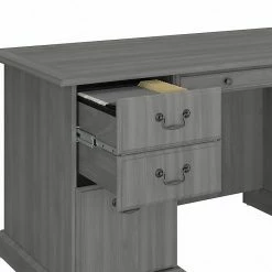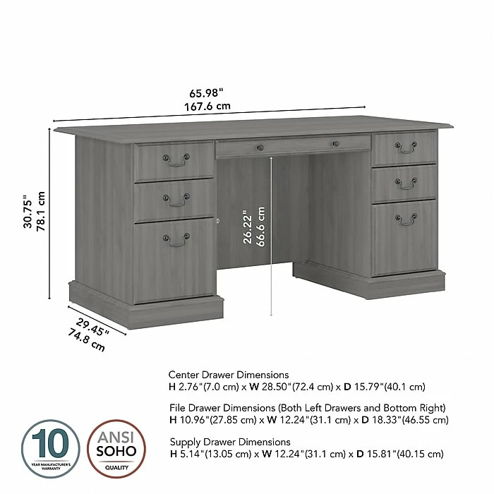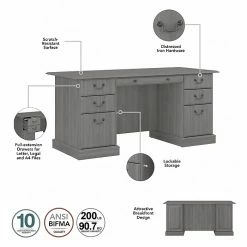 The Bush Furniture Saratoga executive desk with drawers presents a practical, durable workspace that reflects the refined elegance of timeless traditional styling. Whether you’re working hard on an important project, paying bills, or just surfing the web, the spacious 66″W x 30″D desktop offers more than enough room to spread out with materials while supporting up to 200 lbs. Take advantage of two lockable file drawers on the left side of the computer desk to securely organize letter-, legal-, and A4-size paperwork. The right side adds an additional file drawer along with two smaller box drawers for office supplies, and the center drawer provides a convenient place to keep writing utensils, notepads, and other miscellaneous items.