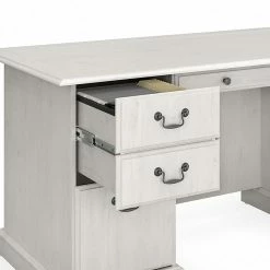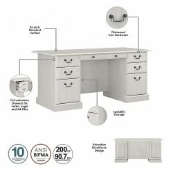The Bush Furniture Saratoga executive desk with file cabinet and bookcase set presents a practical, durable workspace that reflects the refined elegance of traditional styling. A spacious 66″W x 30″D work surface provides plenty of room to spread out with all the materials you need to finish the task at hand, no matter if you’re working on an important project or just surfing the web. The sturdy desktop supports up to 200 lbs. while two file drawers, four box drawers, and a pencil drawer ensure that supplies are never out of reach. Organize letter-, legal-, and A4-size paperwork inside the lockable two-drawer lateral file cabinet. The matching tall five-shelf bookcases both feature three adjustable shelves for flexible storage and two fixed shelves for stability. This executive desk set has been tested to meet ANSI/BIFMA standards for safety and performance and is backed by a 10-year warranty.
