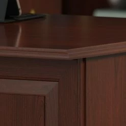 The Bush Furniture Saratoga L Shaped Computer Desk offers luxurious looks at a lasting value. Pen letters, pay bills or outfit your professional-grade home or private office with a traditional L Shaped Desk built for everyday use. The thermally fused laminate surface lasts for years while resisting scratches and stains to protect the warm Harvest Cherry finish. Enjoy all the workspace you need to multitask on the L Shaped Desk, which can be assembled for left or right-handed users. Gold-finished Brass hardware and timeless design accents match the traditional styling of your home office or workspace. Not just for looks, the Computer Desk includes a wide retracting keyboard shelf and three full-extension file drawers, which open on smooth ball-bearing slides. Two box drawers hold office supplies. Backed by a 10 Year Warranty, Saratoga meets ANSI/BIFMA performance and safety standards.