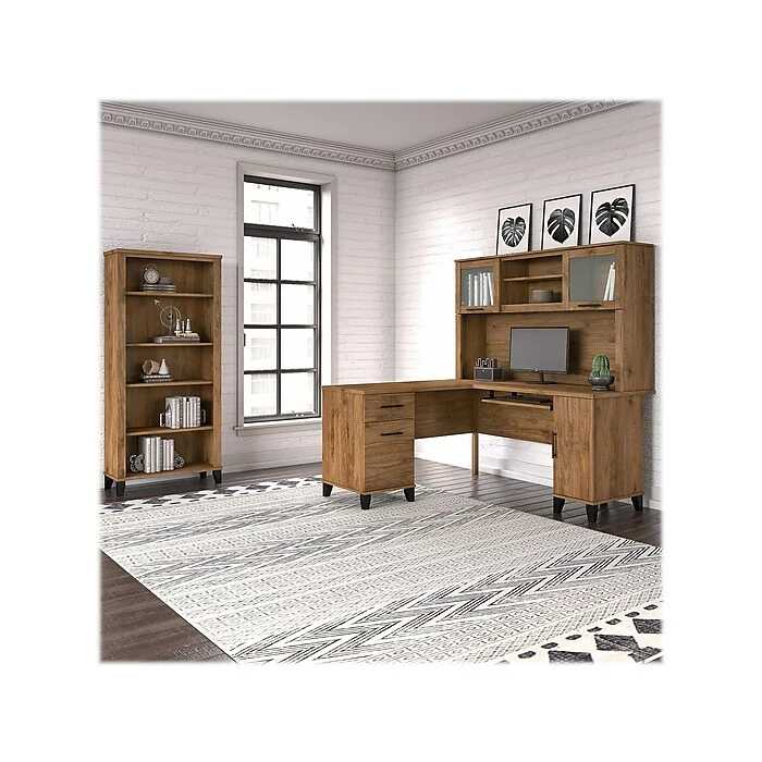 With practical features and a stylish design, the Bush Furniture Somerset 60″W L-shaped desk with hutch and 5-shelf bookcase delivers a personal workspace perfect for the home or small office. The 60″W surface with wire management offers ample room to spread out while a pullout shelf for a keyboard or laptop, vertical cabinet, box drawer, and file drawer offer plenty of storage. The hutch features a large open compartment and two frosted glass doors for concealed storage. Two of the bookcase’s shelves are fixed for stability and three are adjustable to ensure that items of all sizes have their place. Transitional styling includes your choice of attractive finishes with tapered leg accents and contemporary metal hardware. This home office furniture set is tested to meet ANSI/SOHO quality standards for safety and performance and is backed by the Bush Furniture 6-year manufacturer limited warranty.