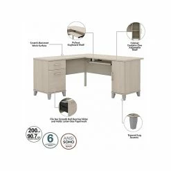 With practical features and a stylish design, the Bush Furniture Somerset 60″W L-shaped desk with hutch and five-shelf bookcase delivers a personal workspace perfect for the home or small office. The 60″W surface with wire management offers ample room to spread out while a pull-out shelf for a keyboard or laptop, vertical cabinet, box drawer, and file drawer offer plenty of storage. The hutch features a large open compartment and two frosted glass doors for concealed storage. Two of the bookcase’s shelves are fixed for stability and three are adjustable to ensure that items of all sizes have their place. Transitional styling includes your choice of attractive finishes with tapered leg accents and contemporary metal hardware. This home office furniture set is tested to meet ANSI/SOHO quality standards for safety and performance and is backed by the Bush Furniture 6-year manufacturer warranty.