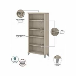 - Bookcase utilizes two fixed shelves for stability and three adjustable shelves for versatile organization