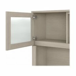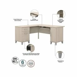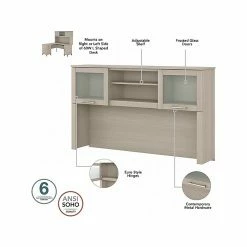 Maximize the potential of your home office with the Bush Furniture Somerset 60″W L-shaped desk with hutch. Create your remote work headquarters with space for a computer, phone, printer, and more. A convenient pullout shelf provides a perfect place to keep a keyboard or laptop, while a storage cabinet and box drawer offer plenty of space for supplies. A file drawer with ball bearing slides allows for easy access to letter-size documents. A wire management slot helps keep cords and cables in order. The hutch features open compartment for books or decorations, an adjustable shelf to hold work in progress, and two frosted glass doors that provide concealed storage. This home office furniture set is tested to meet ANSI/SOHO standards for safety and performance and is backed by the Bush Furniture 6-year manufacturer warranty. American-made with US and imported parts.