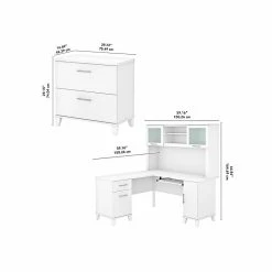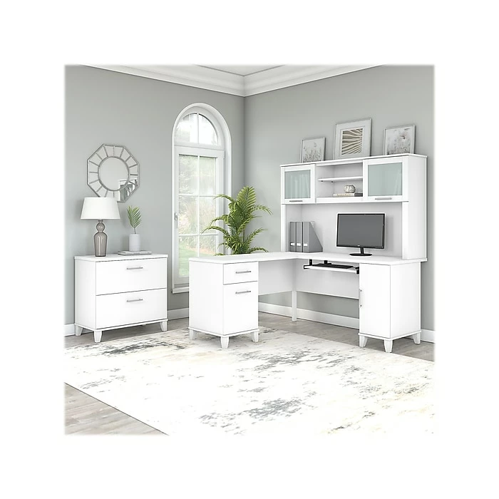 Build your perfect home office around the stylish and functional Bush Business Furniture Somerset L-shaped desk with hutch and lateral file cabinet. The 60″W surface with a wire management grommet offers ample room to spread out while a pull-out tray for a keyboard or laptop, vertical cabinet, box drawer, and file drawer provide plenty of storage space for supplies. The hutch has an open compartment and two frosted glass doors for concealed storage. The lateral file cabinet features smooth ball-bearing slides for easy access to legal- and letter-size paperwork and drawers that open one at a time for maximum stability. The transitional styling includes an attractive finish with tapered leg accents and contemporary metal hardware. This home office furniture set is tested to meet ANSI/SOHO quality standards for safety and performance.