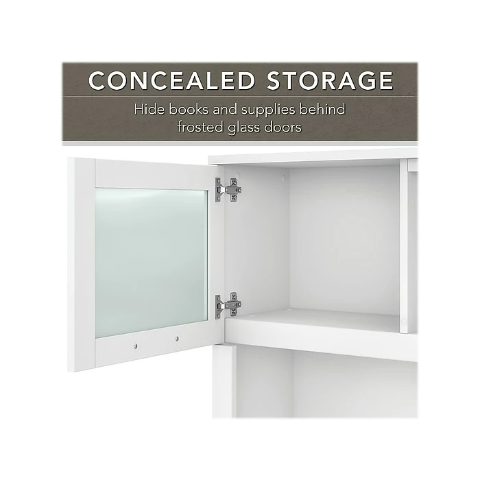 - Hutch has an open compartment and two frosted glass doors for concealed storage