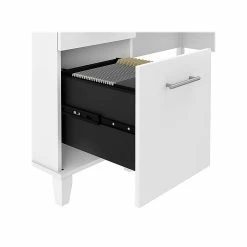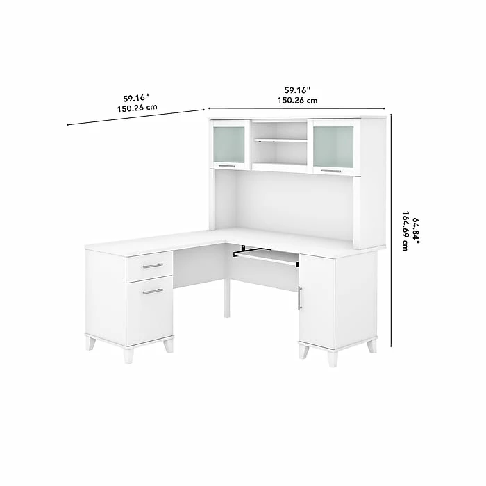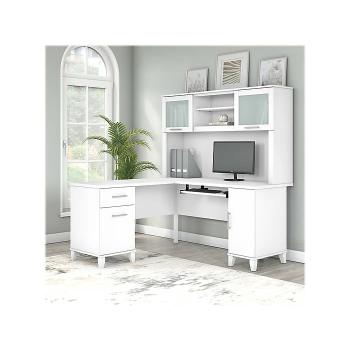The transitional Bush Furniture Somerset 60″W L-shaped desk with hutch offers a stylish and practical workspace solution for the home or small office. Create your remote work headquarters with space for a computer, a phone, a printer, and more. A convenient pull-out shelf provides a perfect place to keep a keyboard or laptop, while a storage cabinet and a box drawer offer plenty of storage for supplies. A file drawer with ball bearing slides allows for easy access to letter-size documents. Wire management slots help keep cords and cables in order. The hutch features open storage with a large compartment for books or decorations, an adjustable shelf to hold work in progress, and two frosted glass doors that provide concealed storage. This home office furniture set is tested to meet ANSI/SOHO standards for safety and performance and is backed by the Bush Furniture 6-year manufacturer warranty. American-made with US and imported parts.