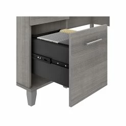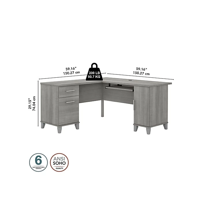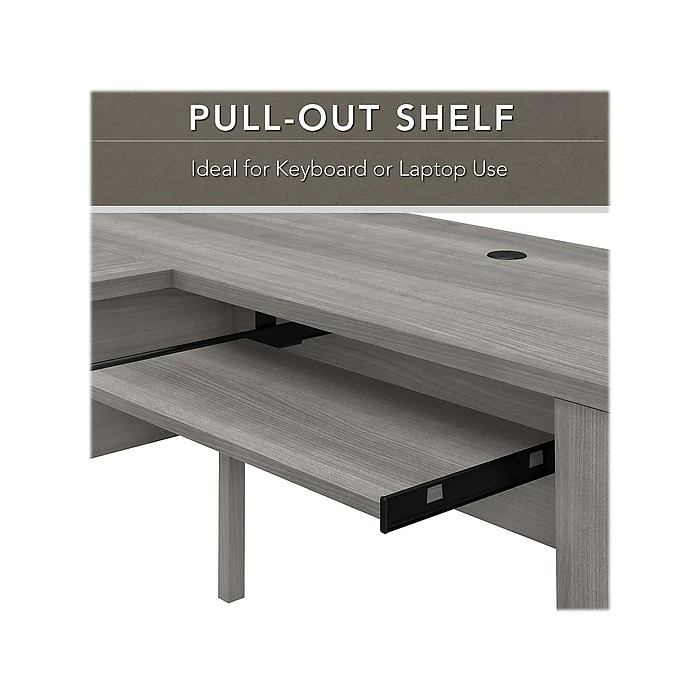 Build your ideal home office around the Bush Furniture Somerset 60″W L-shaped desk featuring transitional style and plenty of storage space for work materials. Maximize the potential of your home office with this desk. Create your remote work headquarters with space for a computer, phone, printer, and more on a surface that features a wire management grommet for keeping cords and cables in order. A convenient pull-out tray provides a perfect place to keep a keyboard or laptop, and the desk also includes a vertical storage cabinet with an adjustable shelf. Place pens, paper, and more in the box drawer, and enjoy a file drawer gliding on smooth ball bearing slides for an easy reach to documents. The transitional styling includes an elegant finish with tapered legs and contemporary metal hardware for an alluring appearance. This L-shaped desk with storage is tested to meet ANSI/SOHO standards for safety and performance and is backed by the Bush Furniture 6-year manufacturer warranty. American-made with US and imported parts.