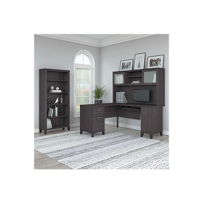 Build your ideal home office around the Bush Furniture Somerset 60″W L-shaped desk featuring transitional style and plenty of storage space for work materials. Maximize the potential of your home office with this L-shaped desk. Create your remote work headquarters with the space for a computer, phone, printer, and more on a surface that features wire management grommets for keeping cords and cables in order. A convenient pullout tray provides a perfect place to keep a keyboard or laptop, and the desk also includes a vertical storage cabinet with an adjustable shelf. Place pens, paper, and more in the box drawer, and enjoy a file drawer gliding on smooth ball bearing slides for an easy reach to documents. The desk in transitional styling offers an elegant finish with tapered legs and contemporary metal hardware for an alluring appearance. This L-shaped desk with storage is tested to meet ANSI/SOHO standards for safety and performance and is backed by the Bush Furniture 6-year manufacturer limited warranty. American-made with US and imported parts.