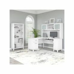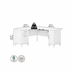 Build your ideal home office around the Bush Furniture Somerset 60″W L-shaped desk featuring transitional style and plenty of storage space for work materials. Maximize the potential of your home office with this L-shaped desk. Create your remote work headquarters with the space for a computer, phone, printer, and more on a surface that features wire management grommets for keeping cords and cables in order. A convenient pullout tray provides a perfect place to keep a keyboard or laptop, and the desk also includes a vertical storage cabinet with an adjustable shelf. Place pens, paper, and more in the box drawer, and enjoy a file drawer gliding on smooth ball bearing slides for an easy reach to documents. The desk in transitional styling offers an elegant finish with tapered legs and contemporary metal hardware for an alluring appearance. This L-shaped desk with storage is tested to meet ANSI/SOHO standards for safety and performance and is backed by the Bush Furniture 6-year manufacturer limited warranty. American-made with US and imported parts.