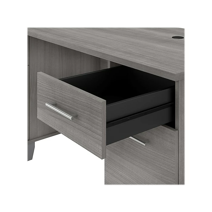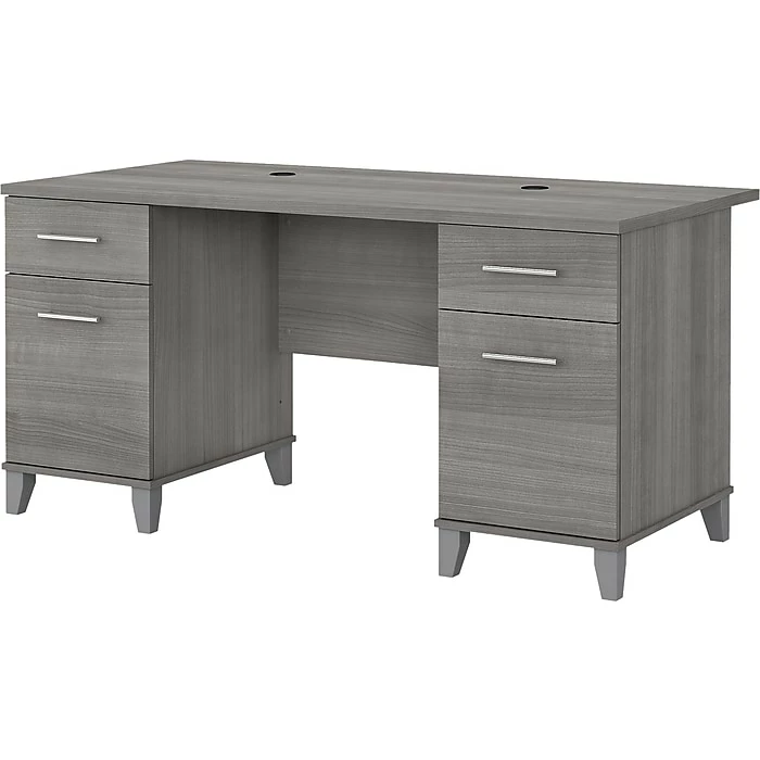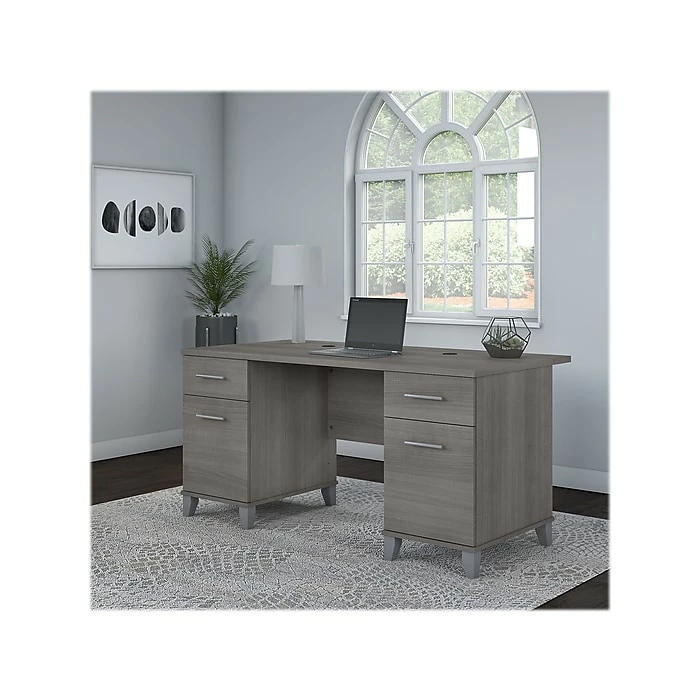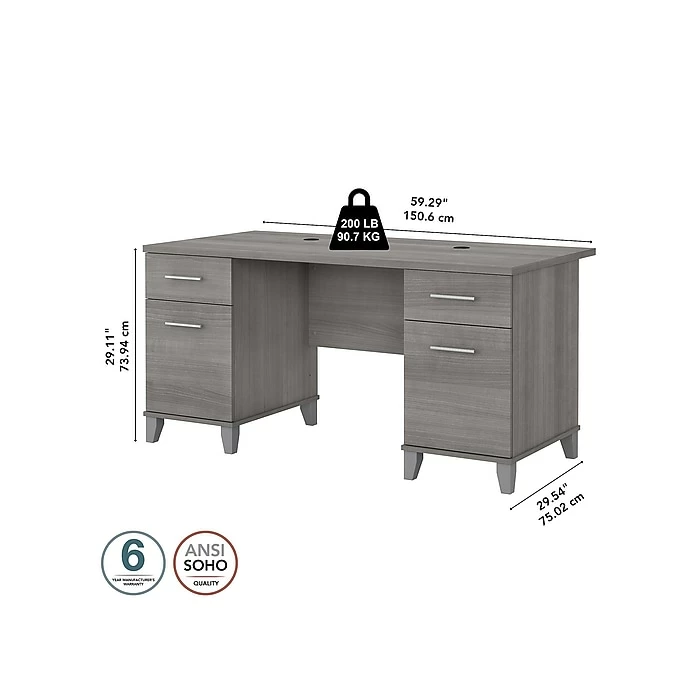 Make the best use of your workspace with the Bush Furniture Somerset 60″W office desk. A perfect choice for your home office, the extended surface provides plenty of room to spread out and features built-in wire management grommets to keep cords in order. Stay organized with two box drawers to house miscellaneous office supplies and two file drawers with smooth ball bearing slides for storing letter-sized documents. The desk in transitional styling offers tapered leg accents, an elegant finish, and contemporary metal hardware for an alluring appearance. This computer desk with drawers is tested to meet ANSI/SOHO quality standards for safety and performance and is backed by the Bush Furniture 6-year manufacturer limited warranty. See the full Somerset collection for coordinating items to complete your personal workspace. American-made with US and imported parts.