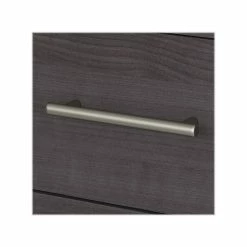 - Laminated over composite wood in a storm gray finish