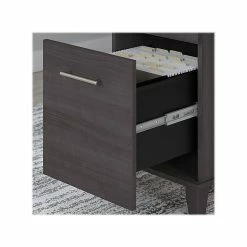 Add a touch of professional style to your workspace with the Bush Furniture Somerset 60″W office desk with lateral file cabinet and five-shelf bookcase. The spacious desktop surface with wire management grommets provides plenty of room to spread out with a computer, paperwork, and more. Two file drawers and a pair of box drawers easily accommodate supplies and documents. The file cabinet opens on smooth ball bearing slides for an easy reach to legal-, letter-, and A4-size paperwork. Two of the bookcase’s shelves are fixed for stability and three are adjustable to ensure that items of all sizes have their place. Transitional styling includes an attractive finish with tapered leg accents and contemporary metal hardware. This home office furniture set is tested to meet ANSI/SOHO quality standards for safety and performance.