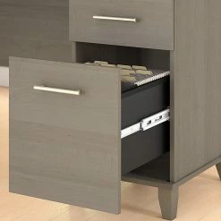 Maximize the potential of your home office with the Bush Furniture Somerset 60W L Shaped Desk with Hutch. Create your remote work headquarters with space for a computer, phone, printer and more. A convenient pull-out shelf provides a perfect place to keep a keyboard or laptop, while a storage cabinet and box drawer offer plenty of storage for supplies. A file drawer with ball bearing slides allows for easy access to letter size documents. Wire management slots help keep cords and cables in order. The Hutch features open storage with a large compartment for books or decorations, an adjustable shelf to hold work-in-progress, and 2 lift-up frosted glass doors that provide concealed storage. This office furniture set is tested to meet ANSI/SOHO standards for safety and performance and is backed by the Bush Furniture 6 Year Manufacturer’s Warranty. American made with U.S. and imported parts.