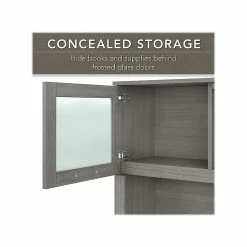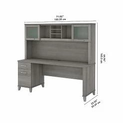 The transitional Bush Furniture Somerset 71″ office desk with hutch offers a stylish and practical workspace solution for the home or small office. A spacious work surface and plenty of storage capacity make this office desk with drawers and hutch a perfect choice for your home office. Spread out with a computer and paperwork while multitasking on an expansive desktop that includes wire management to keep cords and cables in order. The desk’s file drawer opens on smooth full-extension ball bearing slides for easy access to legal- and letter-size documents, while the box drawer keeps the office supplies and utensils you need close by. The hutch attaches to the desktop and adds a pair of frosted glass doors for concealed storage in addition to open cubby spaces with three shelves for books, decorations, and more. This home office desk with drawers and hutch set is tested to meet ANSI/SOHO quality standards for safety and performance and is backed by the Bush Furniture 6-year manufacturer warranty.