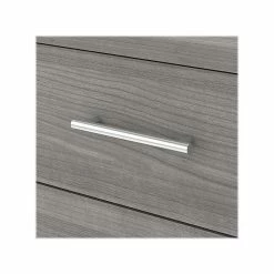 - Made of laminated composite wood, comes in platinum gray