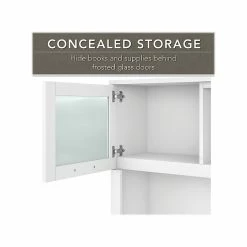 The transitional Bush Furniture Somerset 71″ office desk with hutch offers a stylish and practical workspace solution for the home or small office. A spacious work surface and plenty of storage capacity make this office desk with drawers and hutch a perfect choice for your home office. Spread out with a computer and paperwork while multitasking on an expansive desktop that includes wire management to keep cords and cables in order. The desk’s file drawer opens on smooth full-extension ball bearing slides for easy access to legal- and letter-size documents, while the box drawer keeps the office supplies and utensils you need close by. The hutch attaches to the desktop and adds a pair of frosted glass doors for concealed storage in addition to open cubby spaces with three shelves for books, decorations, and more. This home office desk with drawers and hutch set is tested to meet ANSI/SOHO quality standards for safety and performance and is backed by the Bush Furniture 6-year manufacturer warranty.