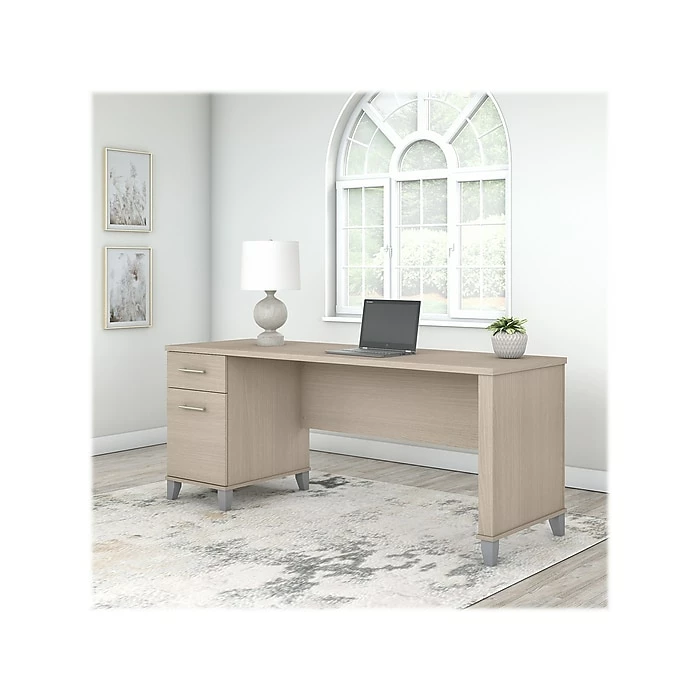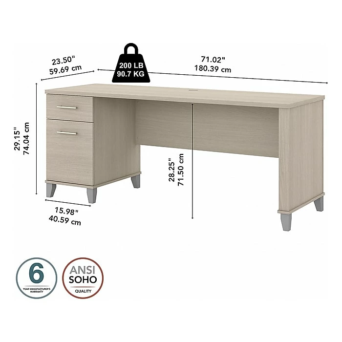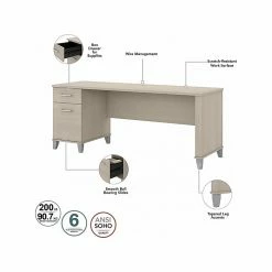 An expansive work surface and built-in storage make the Bush Furniture Somerset 72″W computer desk with drawers a perfect choice for your home office. The spacious desktop offers plenty of room to spread out with a computer and paperwork and includes a wire management grommet to keep cords and cables secure and out of sight. The desk’s file drawer opens on full-extension ball bearing slides for easy access to legal- and letter-size documents, while a box drawer keeps the office supplies and utensils you need close by. A finished back side allows the desk to look great no matter where it’s positioned in the room. The computer desk can also be used with the Somerset 42″W three-position sit to stand return (sold separately) to create an ergonomic height-adjustable workspace. The desk with drawers meets or exceeds ANSI/SOHO standards for safety and performance and is backed by a 6-year manufacturer limited warranty.