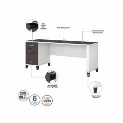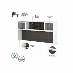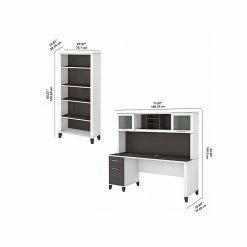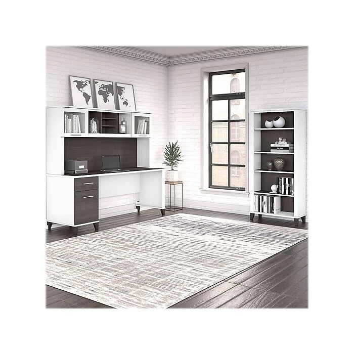 A spacious work surface and plenty of storage capacity make the Bush Furniture Somerset 72″ office desk with hutch and five-shelf bookcase a perfect choice for your home office. Spread out with a computer and paperwork while multitasking on an expansive desktop that includes a wire management grommet to keep cords and cables in order. A file drawer opens on full-extension ball bearing slides for easy access to legal- and letter-size documents, while a box drawer keeps the supplies and utensils you need close by. The hutch adds a pair of frosted glass doors for concealed storage in addition to open cubby spaces with shelves. The bookcase features two fixed shelves for stability and three adjustable shelves to accommodate items of various sizes. This home office desk with drawers and storage set is tested to meet ANSI/SOHO standards for safety and performance and is backed by a 6-year warranty.