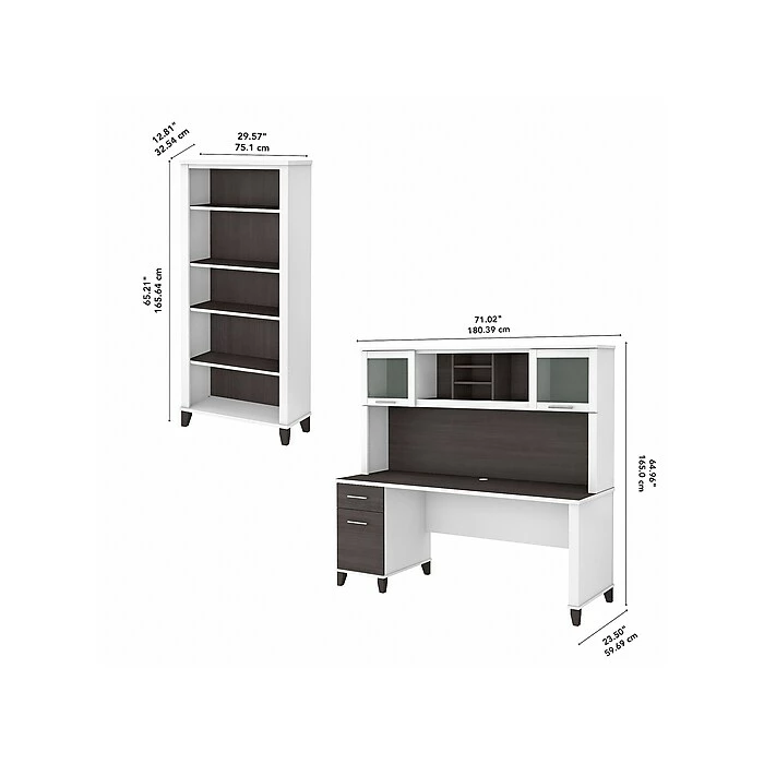 - Assembled dimensions: 65″H x 72″W x 24″D (desk with hutch); 65″H x 30″W x 13″D (bookcase)
