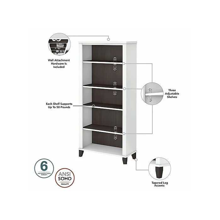 - Bookcase has two fixed shelves for stability and three adjustable shelves for flexible storage and display
