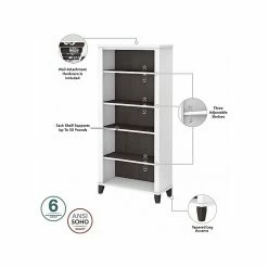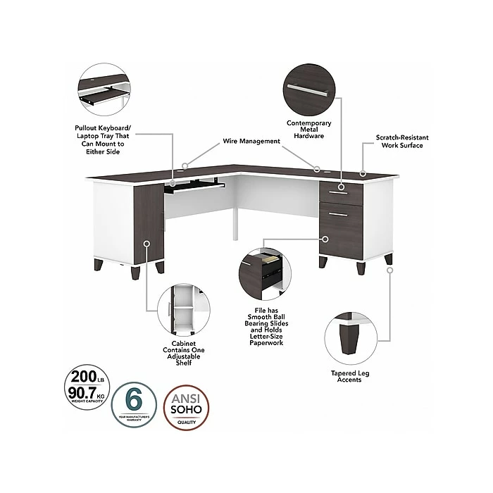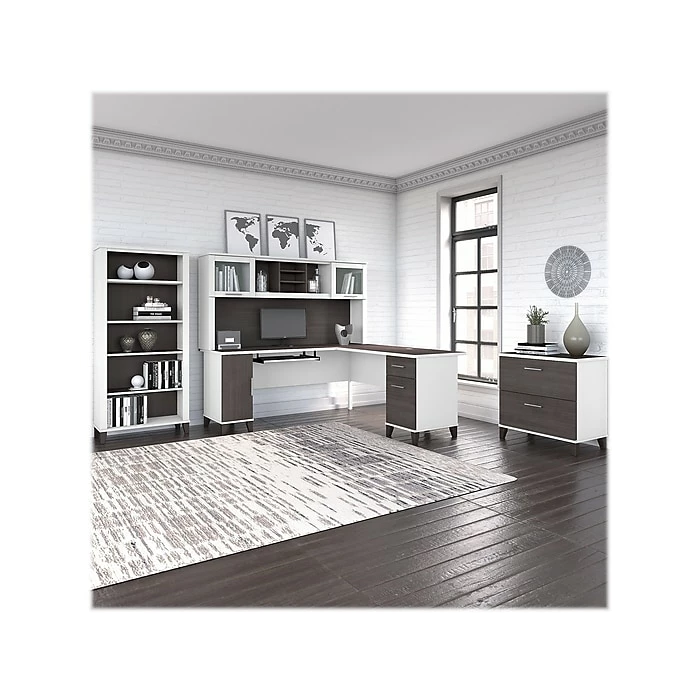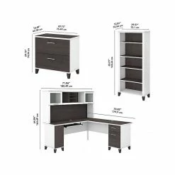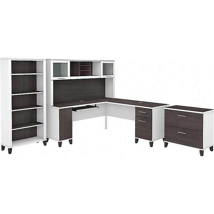 Create a functional and attractive workspace for your home or small office with the Bush Furniture Somerset 72″W L-shaped desk with hutch, lateral file cabinet, and bookcase. The 72″W surface allows for ample room to spread out while a pullout shelf for a keyboard or laptop, a vertical cabinet, a box drawer, and a file drawer provide storage space. The hutch has large open compartments and two frosted glass doors for concealed storage. The file cabinet has smooth ball bearing slides for an easy reach to legal-, letter-, and A4-size paperwork. The five-shelf bookcase features two fixed and three adjustable shelves for versatile organization. Transitional styling includes an attractive finish with tapered leg accents and contemporary hardware. This home office furniture set is tested to meet ANSI/SOHO standards for safety and performance and is backed by a 6-year manufacturer’s warranty.