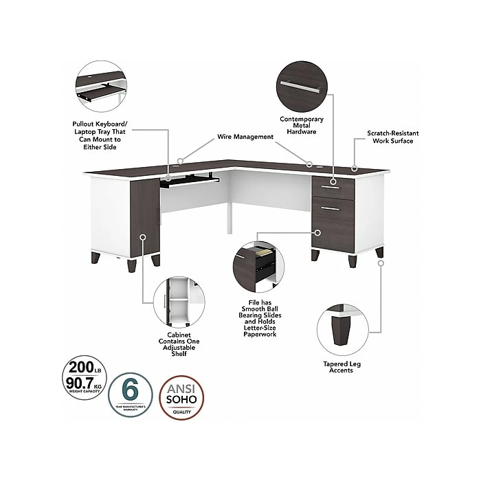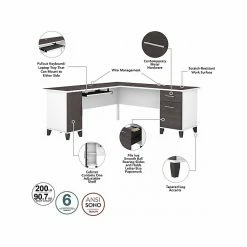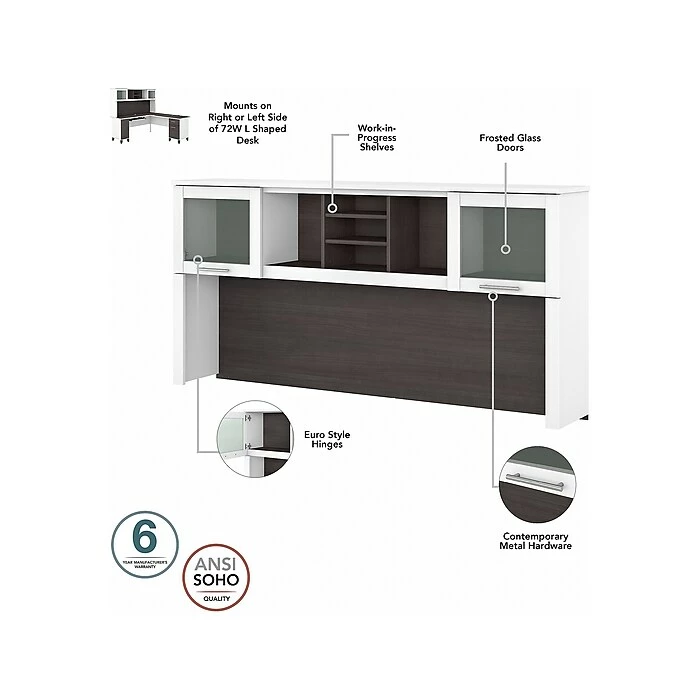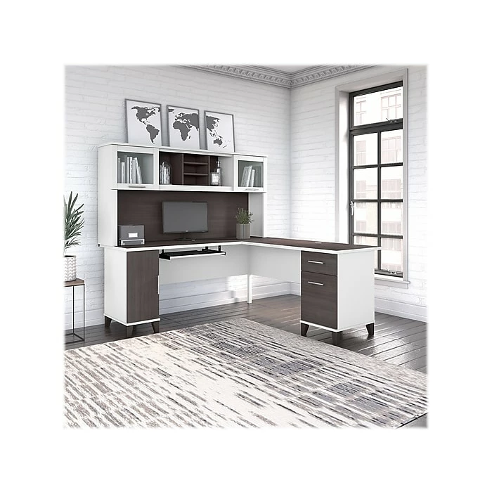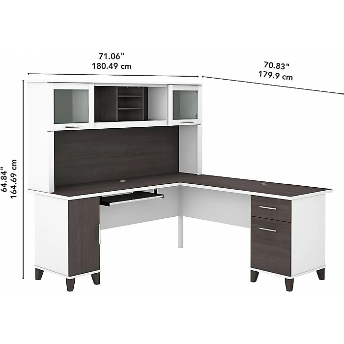 Maximize the potential of your home office with the Bush Furniture Somerset 72″W L-shaped desk with hutch. Create your remote work headquarters with space for a computer, phone, printer, and more. A convenient pullout shelf provides a perfect place to keep a keyboard or laptop, while a storage cabinet and box drawer offer plenty of space for supplies. A file drawer with smooth ball bearing slides allows for easy access to letter-size documents. Wire management slots help keep cords and cables in order. The hutch features open storage with large compartments for books or decorations, two shelves to hold work in progress, and two frosted glass doors that provide concealed storage. This home office furniture set is tested to meet ANSI/SOHO standards for safety and performance and is backed by the Bush Furniture 6-year manufacturer warranty. American-made with US and imported parts.