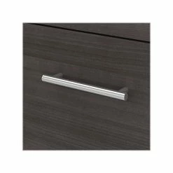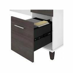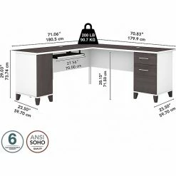 Maximize the potential of your home office with the Bush Furniture Somerset 72″W L-shaped desk with storage. Create your remote work headquarters with space for a computer, phone, printer, and more on a surface that features wire management slots for keeping cords and cables in order. A convenient pull-out shelf provides a perfect place to keep a keyboard or laptop, and the desk also includes a vertical storage cabinet with an adjustable shelf. Place pens, paper, and more in the box drawer, and enjoy a file drawer gliding on smooth ball bearing slides for an easy reach to documents. Transitional styling includes a stylish finish with tapered legs and contemporary metal hardware for an alluring appearance. This desk with storage meets or exceeds ANSI/SOHO standards for safety and performance and is backed by a 6-year manufacturer limited warranty. American-made with US and imported parts.
