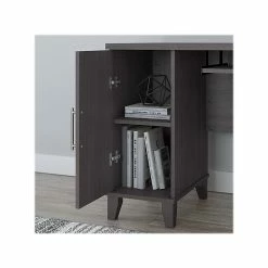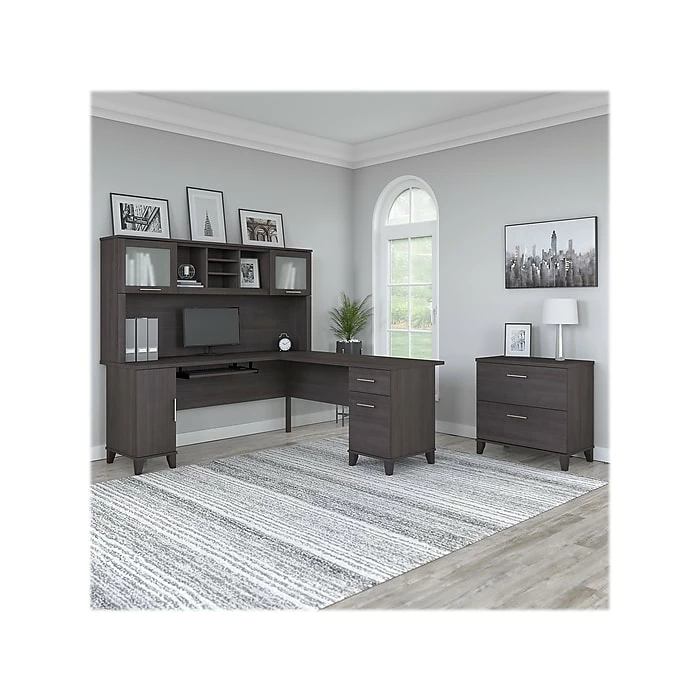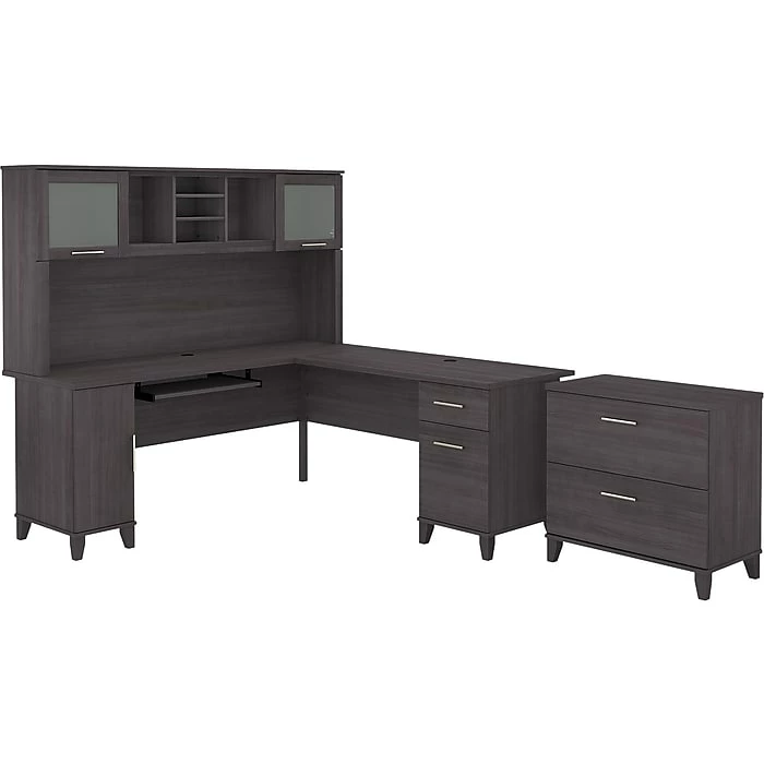 Build your perfect home office around the stylish and functional Bush Furniture Somerset L-shaped desk with hutch and lateral file cabinet. The 72″W surface with wire management grommets offers ample room to spread out while a pull-out tray for a keyboard or laptop, vertical cabinet, box drawer, and file drawer provide plenty of storage space for supplies. The hutch has open compartments and two frosted glass doors for concealed storage. The lateral file cabinet features smooth ball-bearing slides for easy access to legal- and letter-size paperwork and drawers that open one at a time for maximum stability. The transitional styling includes an attractive finish with tapered leg accents and contemporary metal hardware. This home office furniture set is tested to meet ANSI/SOHO quality standards for safety and performance.