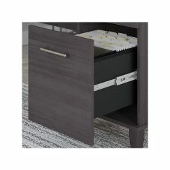 Create a functional and attractive workspace for your home or small office with the Bush Furniture Somerset L-shaped desk with hutch, lateral file cabinet, and bookcase. The 72″W surface offers ample room to spread out while a pullout shelf for a keyboard or laptop, a vertical cabinet, a box drawer, and a file drawer provide storage. The hutch has open compartments and two frosted glass doors for concealed storage. The file cabinet has smooth ball bearing slides for an easy reach to legal-, letter-, and A4-size paperwork. The five-shelf bookcase features two fixed and three adjustable shelves for versatile organization. Transitional styling includes an attractive finish with tapered leg accents and contemporary hardware. This office furniture set meets or exceeds ANSI/SOHO standards for safety and performance and is backed by the Bush Furniture 6-year manufacturer limited warranty.