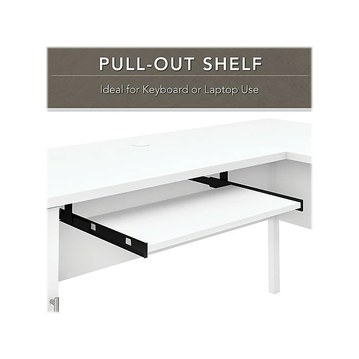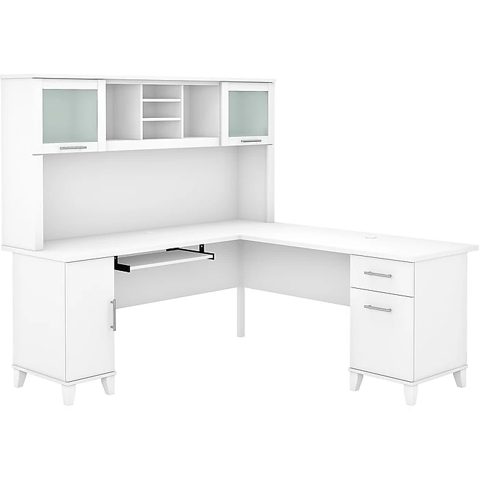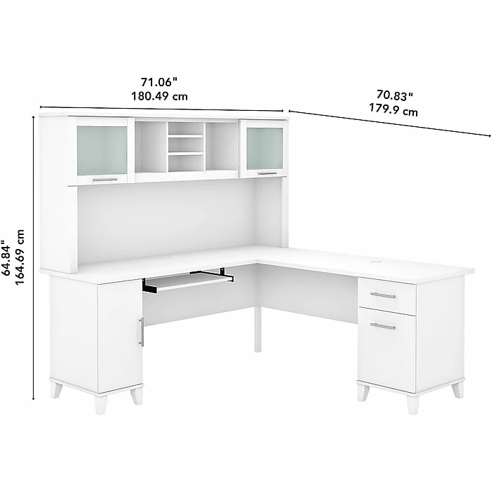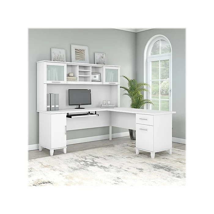 The transitional Bush Furniture Somerset 72″W L-shaped desk with hutch offers a stylish and practical workspace solution for the home or small office. Maximize the potential of your home office with this L-shaped desk with hutch. Create your remote work headquarters with space for a computer, phone, printer, and more. A convenient pull-out tray provides a perfect place to keep a keyboard or laptop, while a storage cabinet and box drawer offer plenty of space for supplies. A file drawer with smooth ball bearing slides allows for easy access to letter-size documents. Wire management grommets help keep cords and cables in order. The hutch features open storage with large compartments for books or decorations, two shelves to hold work in progress, and two frosted glass doors that provide concealed storage. This home office furniture set is tested to meet ANSI/SOHO standards for safety and performance and is backed by the Bush Furniture 6-year manufacturer warranty. American-made with US and imported parts.