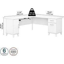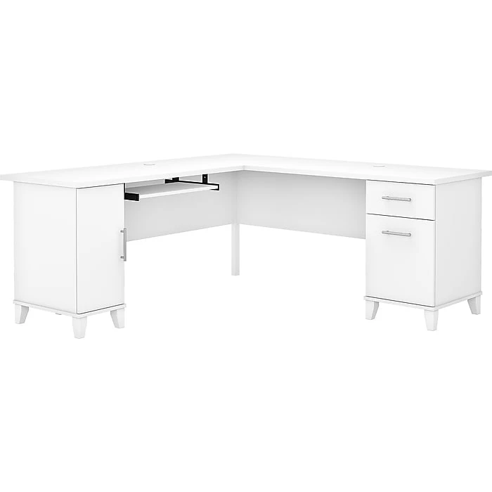 Build your home office around the Bush Furniture Somerset 72″W L-shaped desk with storage, featuring transitional style and plenty of space for materials. Maximize the potential of your home office with this desk. Create your remote work headquarters with space for a computer, phone, printer, and more on a surface that features wire management grommets for keeping cords and cables in order. A convenient pull-out tray provides a perfect place to keep a keyboard or laptop, and the desk also includes a vertical storage cabinet with an adjustable shelf. Place pens, paper, and more in the box drawer, and enjoy a file drawer gliding on smooth ball bearing slides for an easy reach to documents. Transitional styling offers an elegant finish with tapered legs and contemporary metal hardware for an alluring appearance. This desk with storage is tested to meet ANSI/SOHO standards for safety and performance and is backed by the Bush Furniture 6-year manufacturer warranty. American-made with US and imported parts.