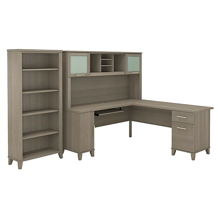 With practical features and a stylish design, the Bush Furniture Somerset 72W L Shaped Desk with Hutch and 5 Shelf Bookcase delivers a personal workspace perfect for the home or small office. The 72W surface with wire management offers ample room to spread out while a pull-out shelf for a keyboard or laptop, vertical cabinet, box drawer and file drawer offer plenty of storage. The Hutch features large open compartments and 2 lift-up frosted glass doors for concealed storage. Two of the Bookcase’s shelves are fixed for stability and 3 are adjustable to ensure that items of all sizes have their place. Transitional styling includes your choice of four stylish finishes with tapered leg accents and contemporary metal hardware. This office furniture set is tested to meet ANSI/SOHO standards for safety and performance and is backed by the Bush Furniture 6 Year Manufacturer’s Warranty.