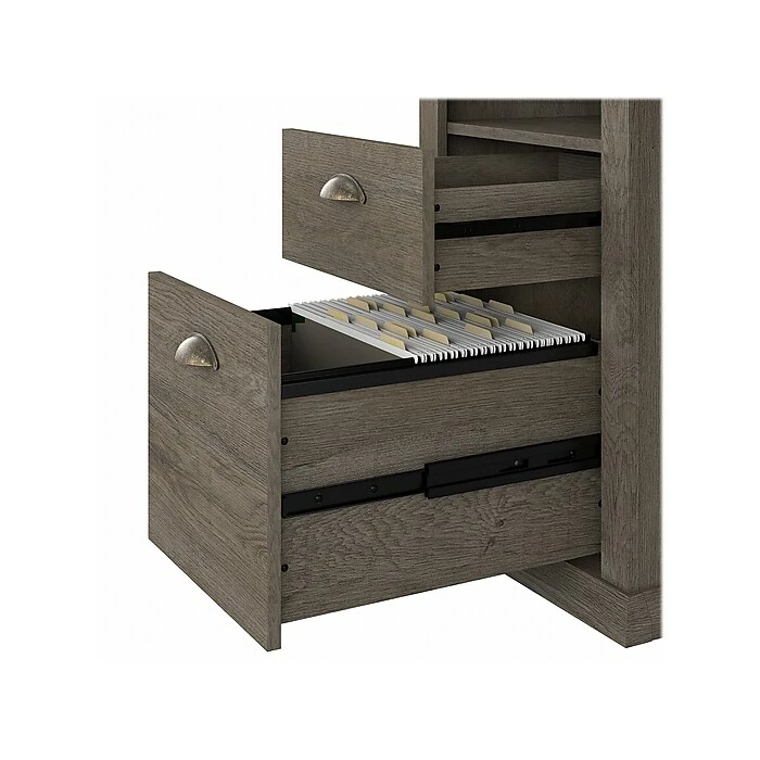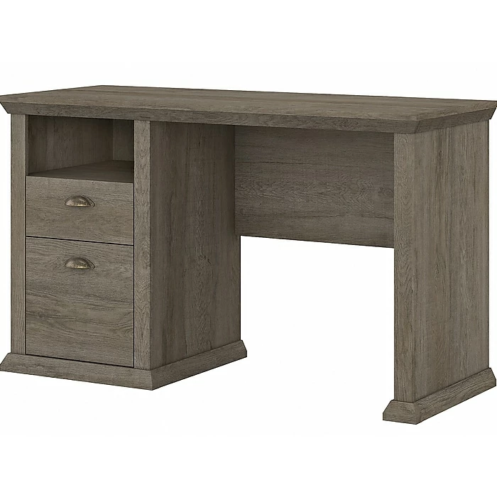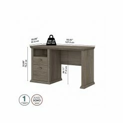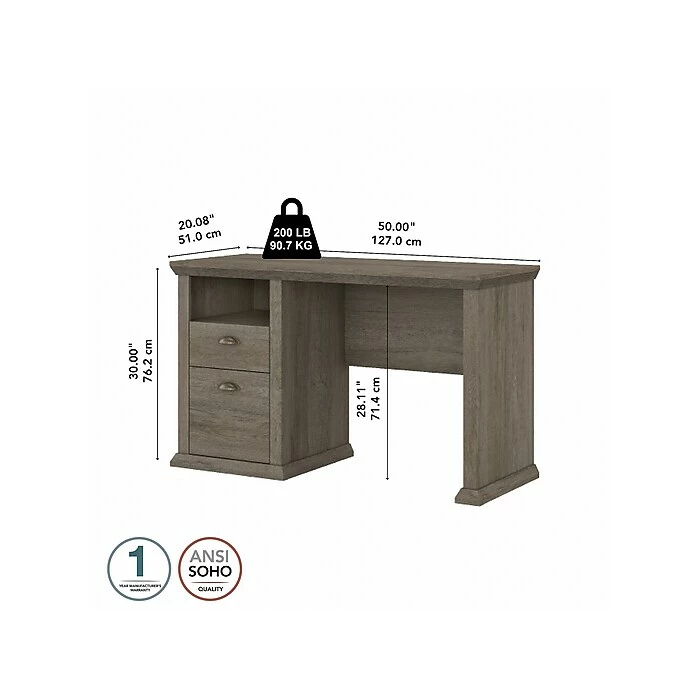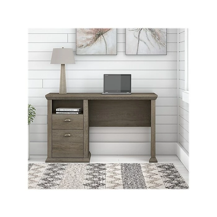 The Bush Furniture Yorktown 50″W home office desk with storage is a great way to maximize the potential of your personal workspace. Designed for placement against a wall, the small computer desk saves valuable floor space while still providing ample room for you to work comfortably. Its durable work surface easily supports a computer, books, and more with a weight capacity of 200 lbs., so you can keep important materials on hand as you take on your next project or assignment. Storage features include a file drawer that opens on smooth full-extension ball bearing slides for an effortless reach to letter-size paperwork, a box drawer for miscellaneous office supplies, and an open cubby shelf for work in progress.