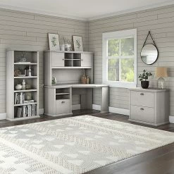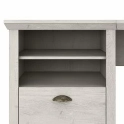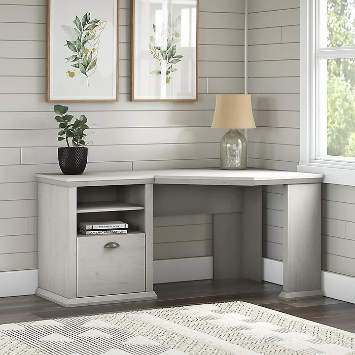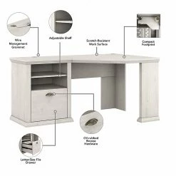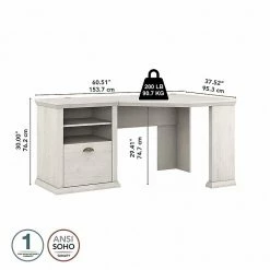 The Bush Furniture Yorktown 60″ corner desk with storage is a great way to maximize the potential of your personal workspace. Designed for placement against a wall, the corner computer desk saves floor space while still providing plenty of room for you to work comfortably. Its durable work surface easily supports a computer, books, and more with a weight capacity of 200 lbs., so you can keep important materials on hand as you take on your next project or assignment. The desktop also has a built-in wire management grommet to accommodate cords and cables. Storage features include a file drawer that opens on smooth, full-extension ball-bearing slides for an effortless reach to letter-size paperwork as well as an open cubby space with one adjustable shelf.